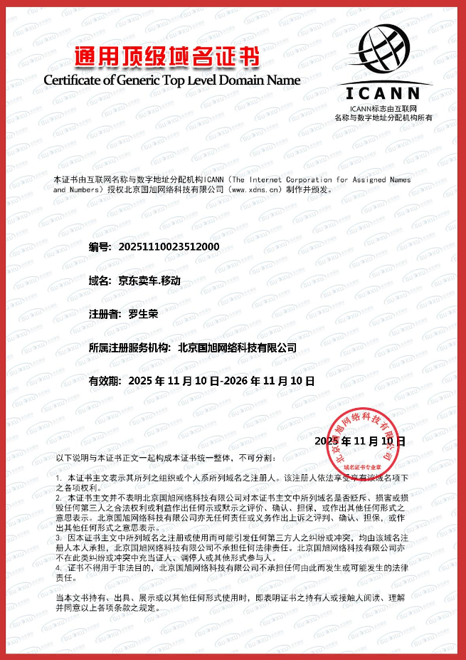 “.com”作为国际通用顶级域,是权威与全球化的象征。而 “.移动” 则是极具前瞻性的新通用顶级域,它精准地抓住了移动互联网时代的核心,明确指向手机端、移动端用户,与当前消费者主要通过手机APP、小程序购车、看车的趋势完美契合。“京东卖车.移动”这个组合,本身就是一句完整的广告语,在移动端输入和传播极具优势。